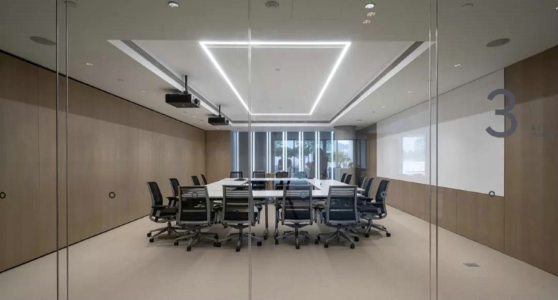 一、通高的玻璃隔斷系統 ▶玻璃隔斷分類 ◎根據玻璃層數不同,可以分為單層玻璃系統,雙層玻璃系統; ◎根據框架樣式,我們可以分為明框系統、隱框系統; ◎根據框架材質不同,我們可以分為全鋁框架系統,全鋼框架系統; ◎根據房間私密性,可以有內置百葉的雙層玻璃系統或電子調光玻璃等。 1、單層玻璃隔斷。辦公裝修中經常采用10mm或12mm厚的鋼化玻璃或6+6厚的夾膠玻璃,來作為辦公隔斷使用,這是單層玻璃隔斷。用途是一些對私密性要求不高的小型會議室,或展示展覽空間。