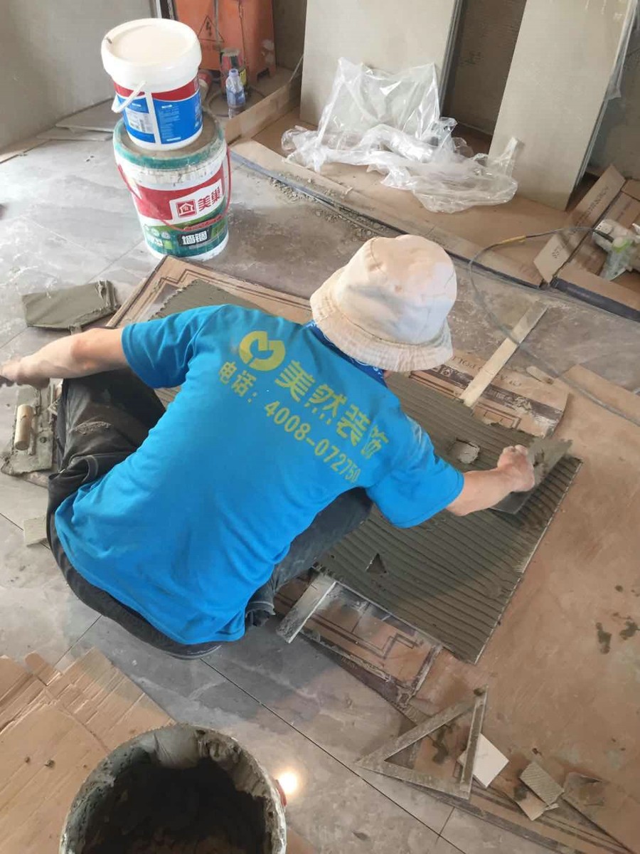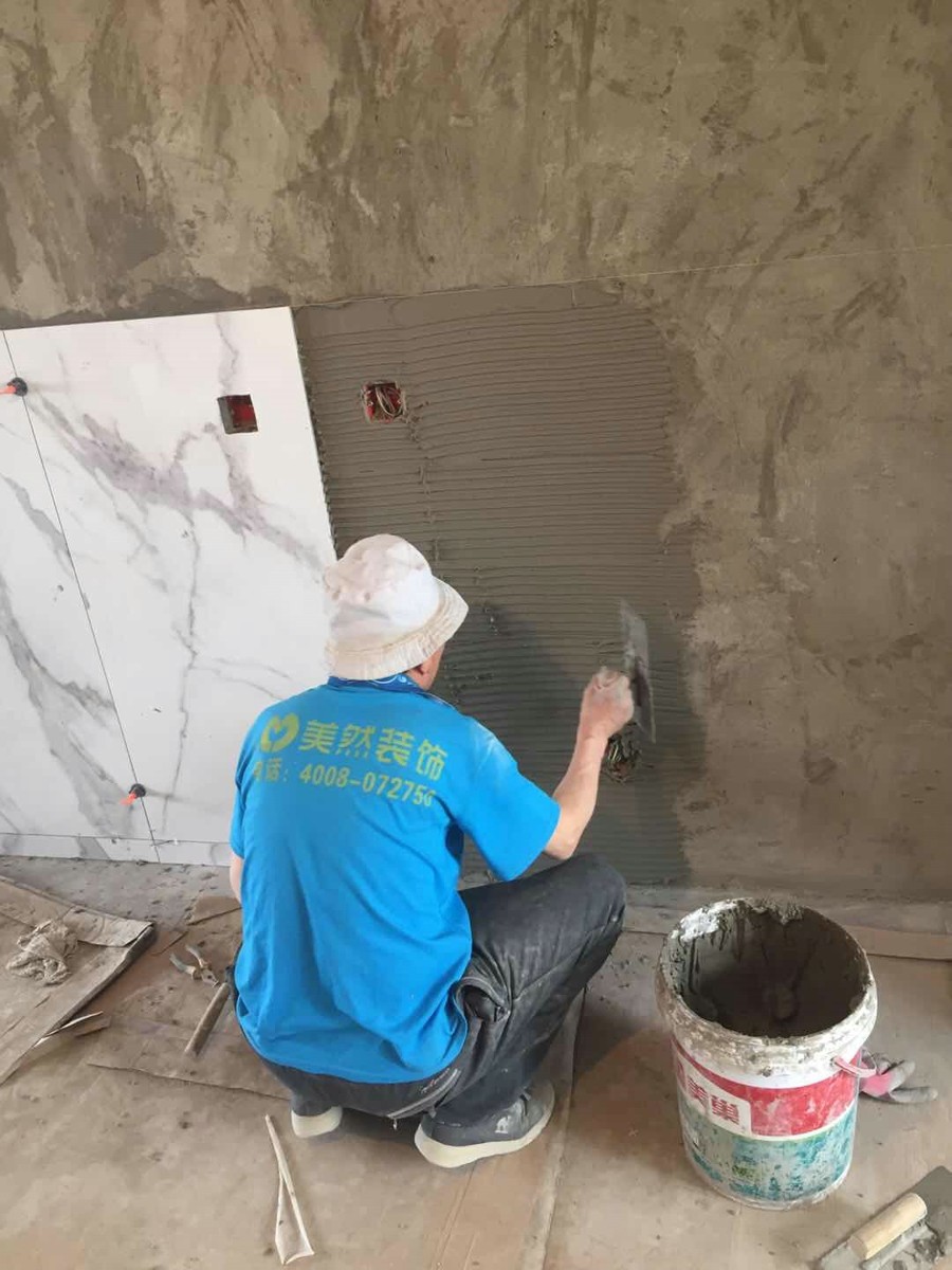 五、5月3日,今天正在進(jìn)行電視背景墻施工,干活的是李師傅,貼磚20多年了,在美然裝飾也是老工人,聽說有八年了,干活挺認(rèn)真的,手藝不錯,工程負(fù)責(zé)人說為了防止瓷磚脫落,用的是薄貼法施工,這樣比較結(jié)實(shí)。
